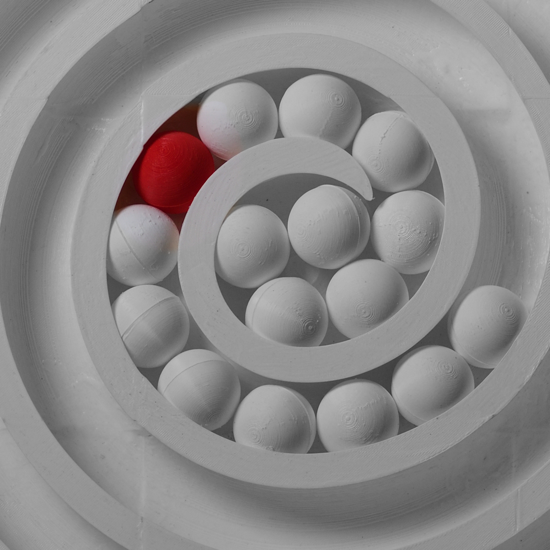 The sculpture begins with a simple gesture: a hand moving a sphere. Nothing is fixed. Each sphere can be shifted or exchanged, and every small adjustment changes the whole. What was central moves outward. What was quiet becomes visible. Even the red sphere may take the centre — or not. The choice is yours.